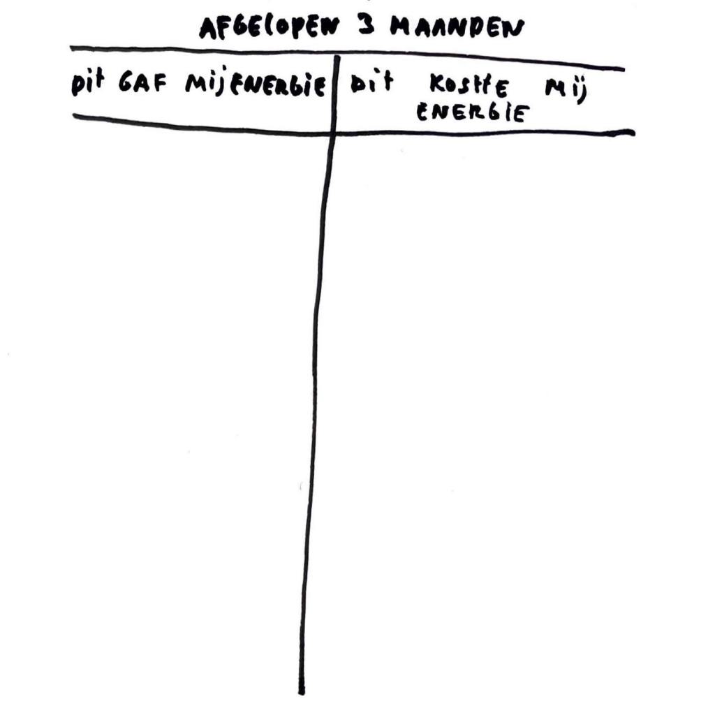 Een leuke opdracht die ik hoorde in de xx prodcast: schrijf van de afgelopen 3 maanden op wat je energie gaf in de linker kolom en wat je energie geeft in de rechter kolom. Ook hierbij geld, mocht je moe zijn, doe af en toe wat meer van de dingen in je linker kolom.