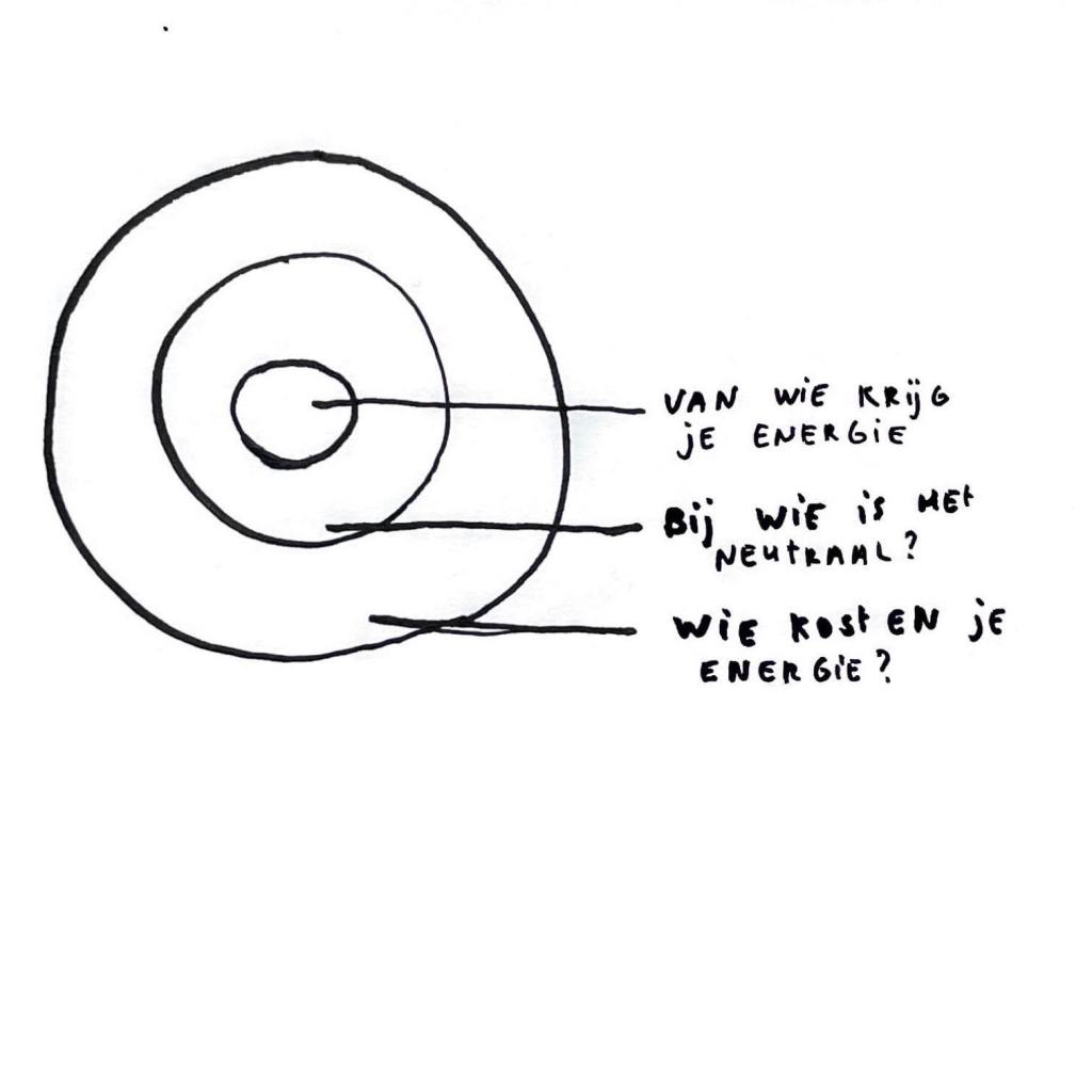 Ken je die, de ui grafieken waarbij je je meest dierbaren in het midden zet, de ook best belangrijke in de tweede ring en de ok ok mensen in de buitenste ring?- maar voor deze oefening werkt het anders – nu zet je de mensen waar je energie van krijgt in de middelste ring, het maakt niet uit of je ze nog maar 1x hebt gezien of dat je ze elke dag ziet. Het kan zo zijn dat de barista van een koffiezaakje in je middelste kring beland. In de tweede ring zet je de mensen waarbij je energie redelijk neutraal blijft, en in de derde ring schrijf je de mensen op waarbij het je energie kost om met ze af te spreken. Het is ok dat je van sommige mensen geen energie krijgt – er zullen weer andere mensen zijn die wel energie van hun krijgen.