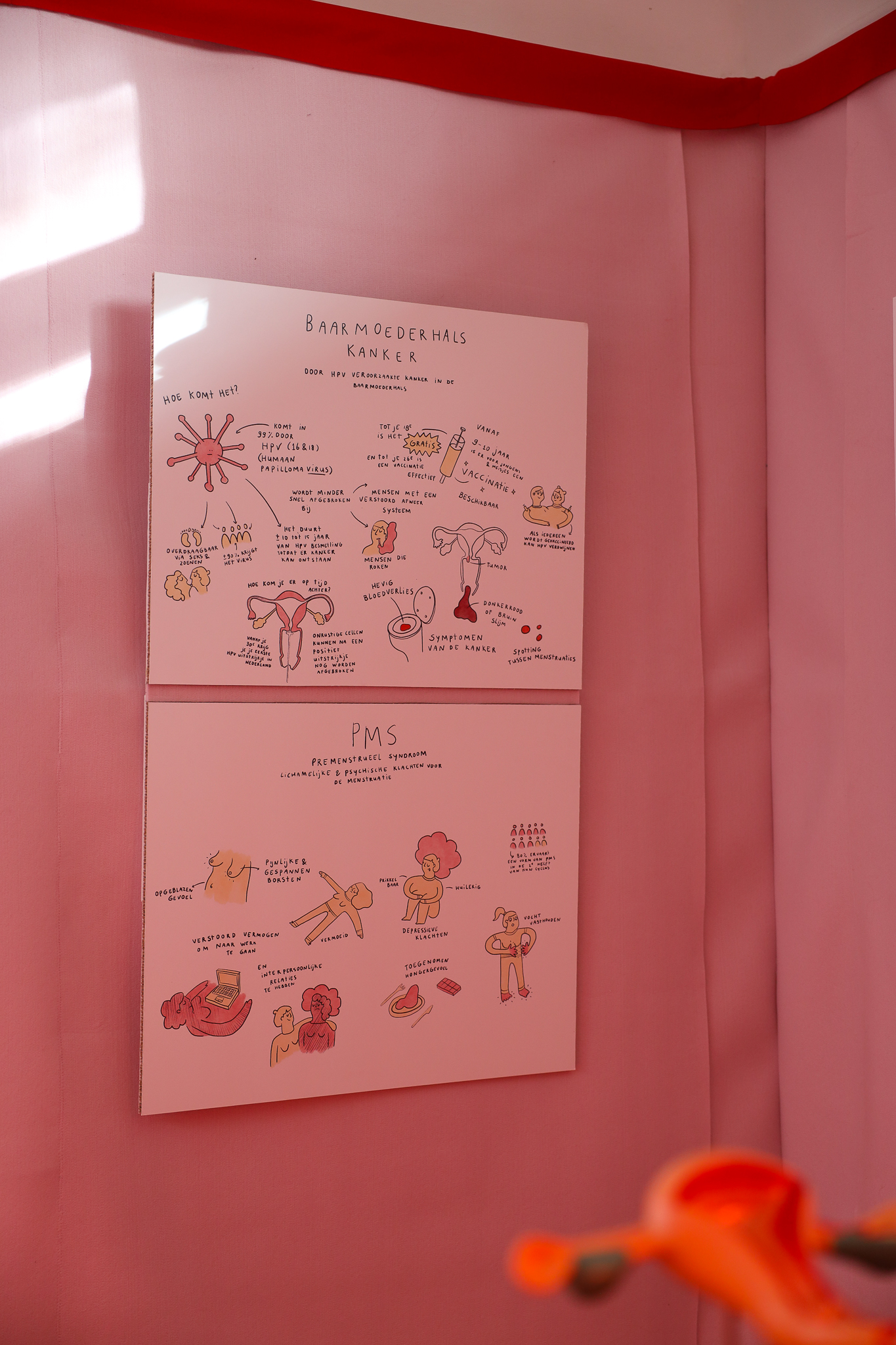 Hiervoor heeft Rosanne illustraties gemaakt van acht veelvoorkomende aandoeningen, een menstruatie met weinig klachten en de overgang en hun bijbehorende klachten. Er is samengewerkt met gyneacoloog Marlies Bongers om de illustraties te evalueren en aan te vullen. Anna Musch, multidisciplinair ontwerper, heeft een wereld om de illustraties ontworpen door middel van een pop-up museum zaal, een interactieve wand waar bezoekers verhalen kunnen delen en een baarmoederkostuum.
