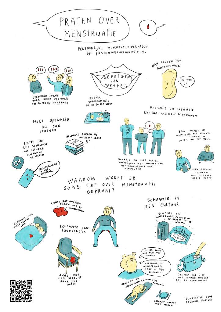 Voor de Lancering van de module menstruatie verhalen op pratenovergezondheid.nl door Lisa Zuidema is een praatplaat geïllustreerd. Deze werd tijdens de lancering verspreid. Heb je interesse in een poster voor in je praktijk? Neem contact op met Lisa Zuidema.